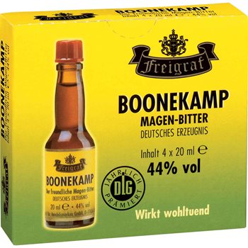 Boonekamp bitter is a bitter of German origin. This type of bitter is known as a morning pick-me-up or as an appetizer, for which Boonekamp can definitely be used. However, this bitter can also be used for other purposes. This bitter is made according to a German recipe, and it also aims to relieve stomach aches and can also help if you experience problems with digestion. A dry bitter with a nice soft fullness. Here you get it in a pack of 4 small bottles of 20 ml.