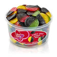 Well-known wine gum from Red band. Here you get a 1200g tin filled with delicious quality wine gums and licorice. In the special "zombie smile" version, you get the round smileys, but this time with a mixture of delicious licorice and delicate fruit wine gum. Two lovely halves which in combination create a piece of tasty candy.
