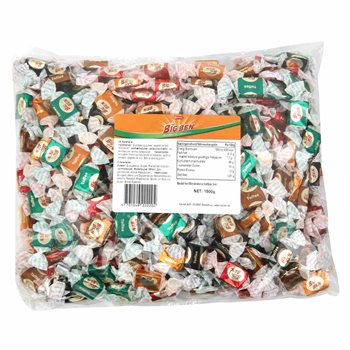 Her får du en jumbo -taske med 1,5 kg blandede Big Ben Toffees. Tasken indeholder forskellige varianter med smag af rom, hasselnød, kakao, lakrids og fælles. Toffee - I alt ca. 400 stk. Big Ben Caramels er en Candy Classic, der aldrig går ud af stil og appellerer til de fleste mennesker. Denne store taske er perfekt til skoleuddannelser, juleuddannelser osv.