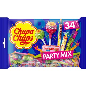 Chupa Chups Party Mix es una bolsa llena de los queridos y coloridos dulces Chupa Chups. La bolsa contiene I.A. Las conocidas piruletas con sabores de fresa y manzana y los caramelos de frutas suaves y las barras de caramelo fruitella. La mezcla perfecta para la fiesta Mardi Gras o Halloween.