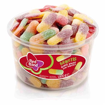 Super Sauer al trupei roșii Brikett este o gumă de vin interesantă care combină dulce cu acru. Acest lucru duce la o experiență gustativă, puțin ieșită din comun. Piesa de bomboane este împărțită în două jumătăți, fiecare având propria culoare și, prin urmare, fiecare gust propriu. Guma de vin acru este confiată cu zahăr. Fiecare cutie conține 1150 de grame de gingii de vin.