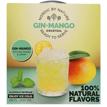 Gin-Mango de la Nordic by Nature este un cocktail gata de servit, care ar trebui să fie bucurat de gheață cu frunze proaspete de mentă. Există pentru aprox. 12 pahare în pachet. Gin-Mango este format din gin, sirop de mango și suc de lămâie. Conține doar arome naturale