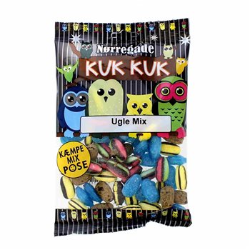Nørregade Kuk Kuk Ugle Mix sunt bomboane de calitate din cea mai veche fabrică de bomboane din Danemarca. Geanta conține bomboane viu colorate în formă de bufniță cu arome de, printre altele, mentol proaspăt și licor puternic. Un amestec minunat pentru toți fanii bomboanelor și pentru mulți, bomboanele de bufnițe sunt sinonime cu gustul lui Childhoo