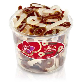 Gumă de vin cu două tonuri cu aromă de cola-un adevărat clasic în dulciuri. Roșu Band Cola Sutter este disponibil într -o cutie mare cu peste 1 kilogram de gumă de vin. Gustul este convingător, iar gustul colailor nu este cu siguranță compromis.