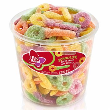 Gumă de vin acru cu aromă de fructe din banda roșie. Suzetele de la roșu sunt viu colorate, ceea ce le face o lovitură sigură cu cei mici. Mai mult, numeroasele culori înseamnă, de asemenea, că obțineți o mulțime de arome în aceeași bucată de bomboane. Teaturile sunt, de asemenea, confiate cu zahăr, ceea ce contribuie la bunul gust și compensează aciditatea. Găleata cu 1200 de grame conține aproximativ 100 de tetine de gumă de vin.